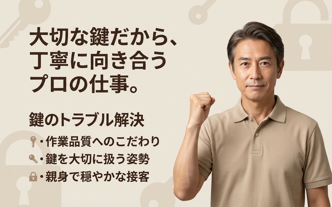 到着後は一級鍵師の方が作業してくれ、鍵の種類の違いや防犯性能について分かりやすく説明してくれました。対応がとても親切で、不安が解消されてよかったです。