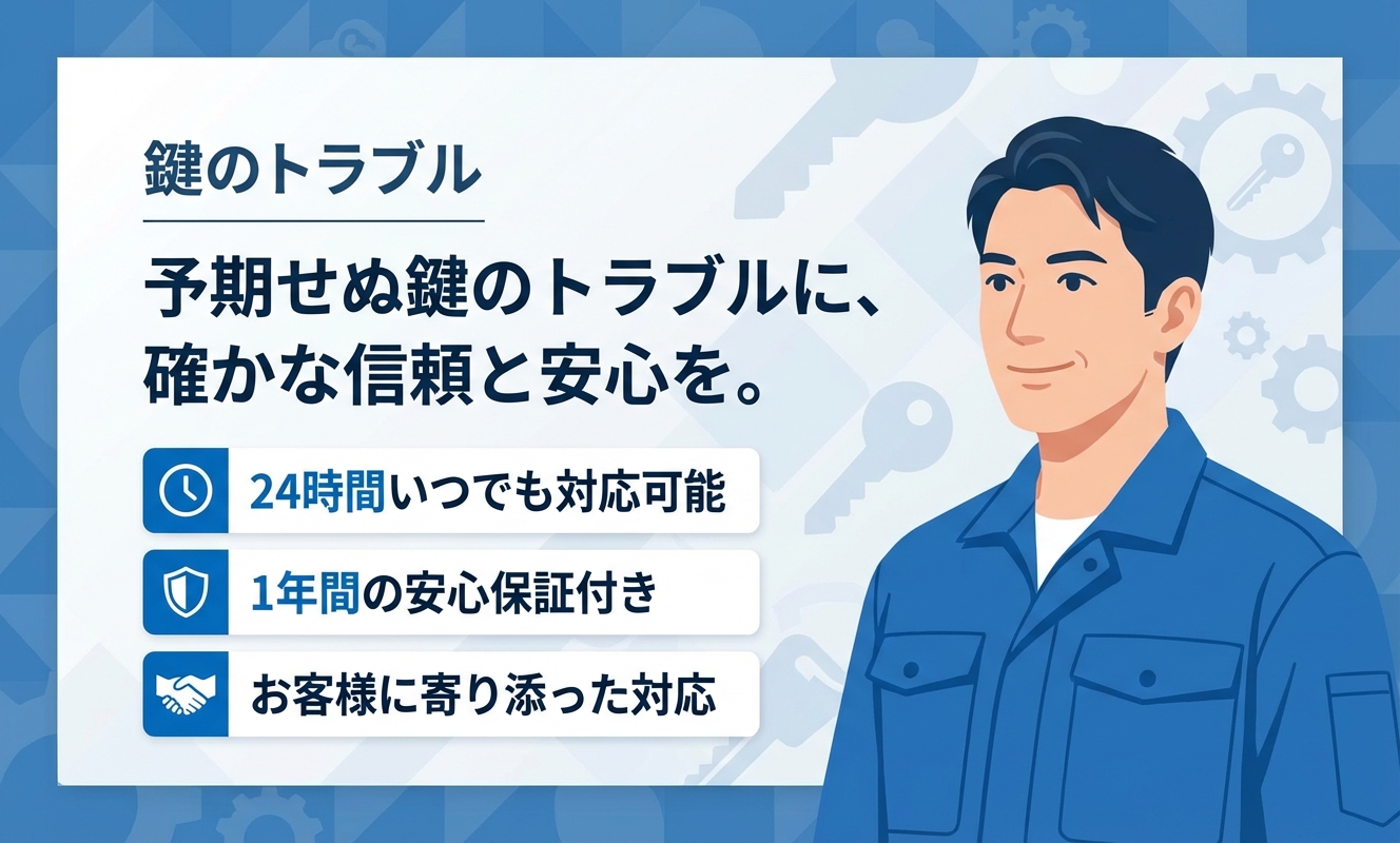 Keys Homeは、広範囲のエリアで活躍する迅速な対応力が魅力の専門業者です。深夜・早朝の鍵トラブルにも24時間体制で対応し、最短30分での駆けつけは急ぎの際に非常に頼りになります。また、すべての施工に1年間の保証を付帯しており、施工後の不具合にも無償対応可能という、ユーザーにとって安心材料となる体制を整えています。