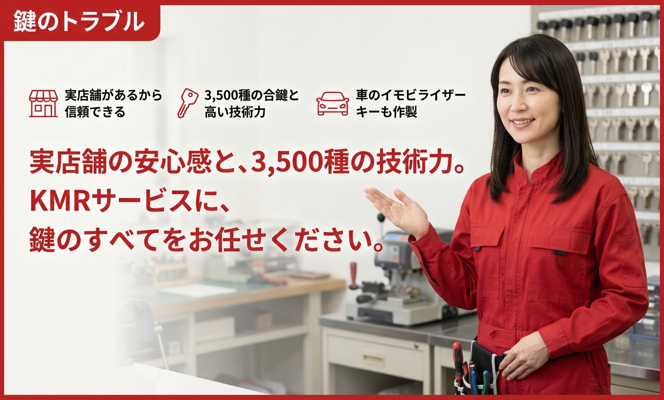 ケイ・エム・ロックサービスの最大の強みは、「実店舗がある」という安心感です。出張専門の業者と違い、店舗で直接相談できる窓口があり、急なトラブル後の防犯相談や、特殊な鍵の合鍵作製(世界の合鍵3,500種類対応)など、長期的なサポートを期待できます。また、自動車のイモビライザーキーのような高度な技術を要する作業にも対応しており、地域で長く付き合える信頼性の高いプロショップです。