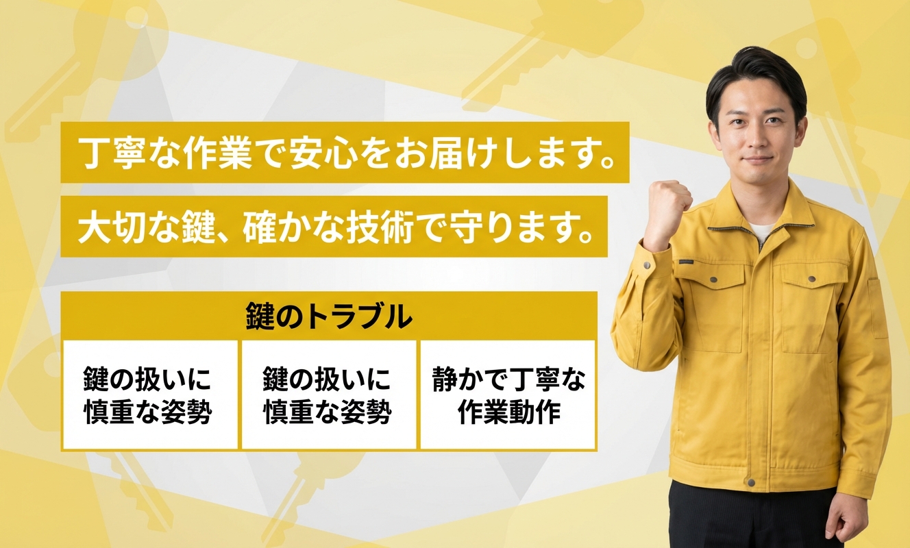 依頼後すぐに来てくれて、慎重に作業を進めてくれました。壊すことなく開けてくれたのは技術力の高さを感じました。費用も無理のない範囲で収まり、丁寧な説明も好印象でした。