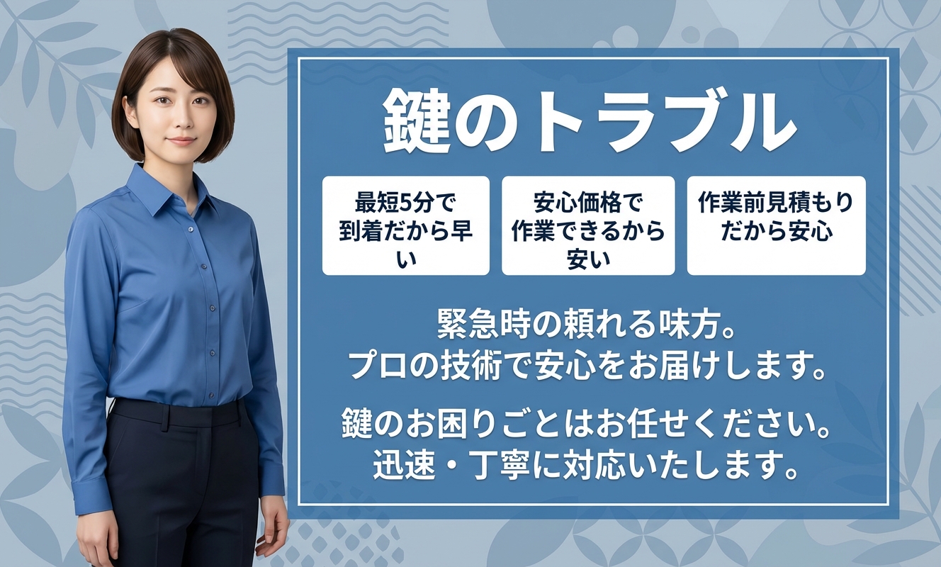 「カギの救急110番」は、日本全国に出張対応している鍵屋さんです。高い技術力を活かしたスピード解決を得意としており、ディンプルキーや電子錠など、どんな鍵でも対応してもらえます。また、鍵のことだけでなく、窓ガラスの強度を高める防犯フィルムの施工や、防犯カメラの設置など、防犯対策についてもお願いすることができます!綺麗な服装でマナーある接客を心がけており、お客様相談センターもありますので、安心して作業をお願いすることができます。鍵交換・鍵取付については、1年間の保証が付いているのもうれしいところです。