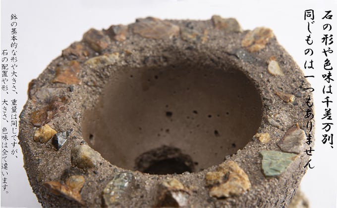 これらを土器風に調色した白セメントで固めることで、さざれ石のような素朴な表情を実現しています。均一に整えられた量産品とは異なり、自然素材ならではの粒感や色味のゆらぎが感じられる仕上がりです。