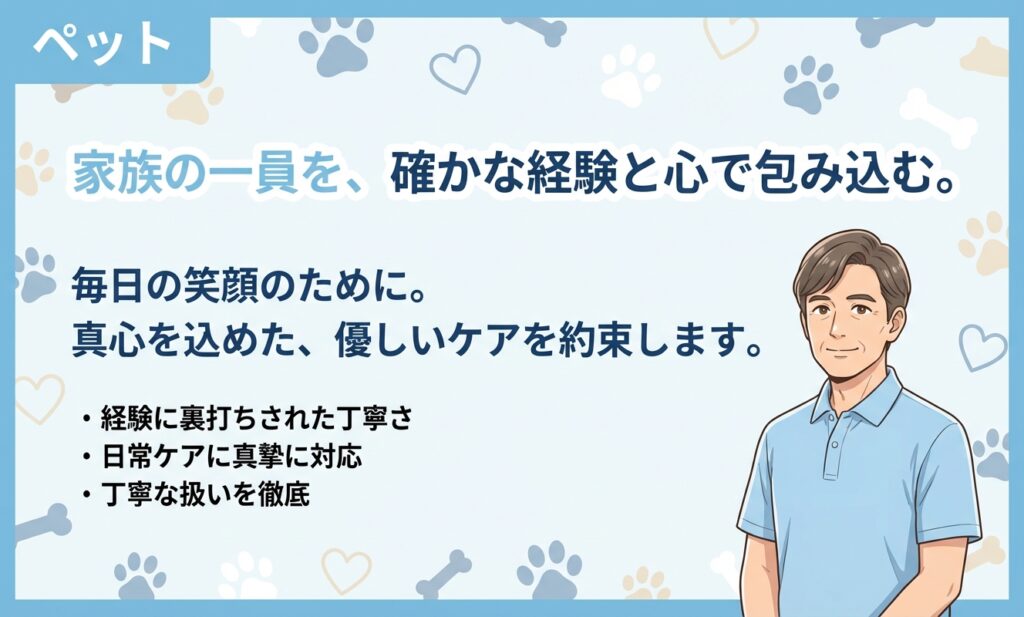 ペットの餌やトイレ用品、特に必要なケア用品などを事前に用意していただくことをお勧めします。また、ペットの健康状態や日常のルーティンについての情報など事前に事業者様にお知らせください。