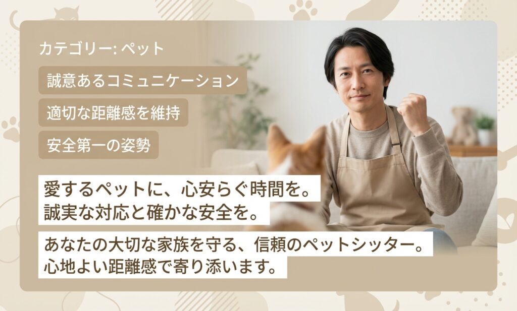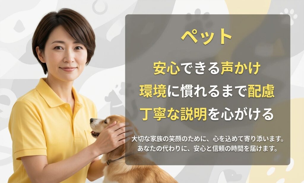 ペットシッターは、ペットの餌やり、トイレ掃除、遊び時間の確保、散歩など、日常のケアを行います。特別なケアが必要な場合は、事前に事業者様にご相談ください。