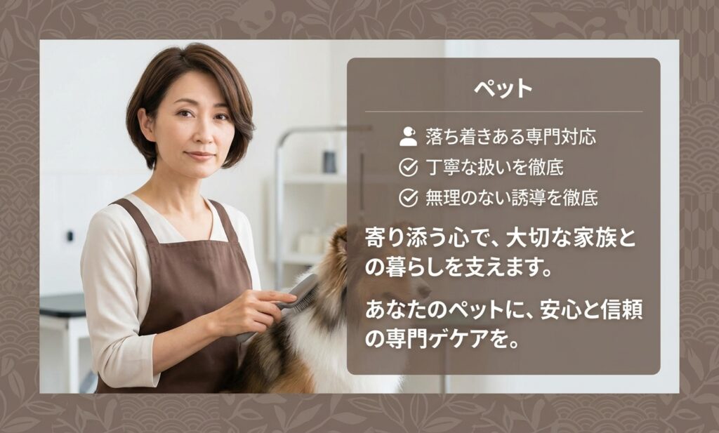 ペットの餌やトイレ用品、特に必要なケア用品などを事前に用意していただくことをお勧めします。また、ペットの健康状態や日常のルーティンについての情報など事前に事業者様にお知らせください。