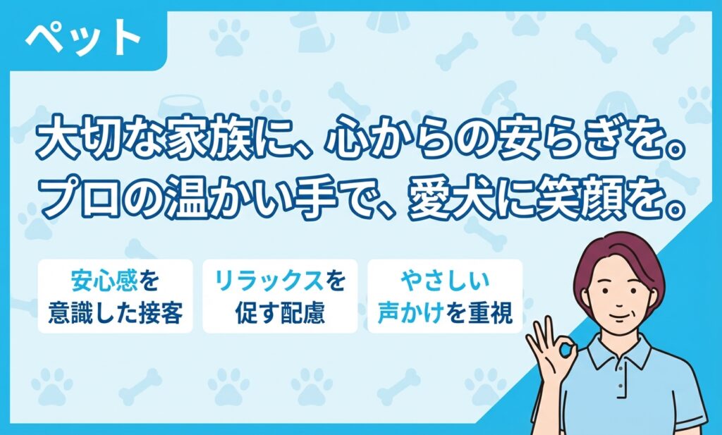 通常、1回の訪問につき30分から1時間程度の滞在が一般的です。ただし、ペットの種類やニーズに応じて滞在時間など事業者によってことなりますので事前に事業者様にご相談ください。