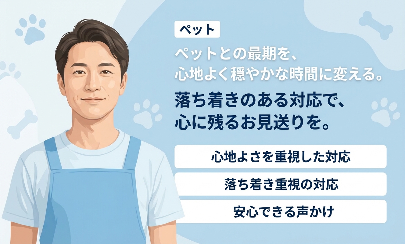 訪問火葬を行っており、自宅や希望の場所で最後の時間を過ごせるのが特徴です。また、屋内の斎場を利用すれば、天候を気にせず家族だけでお別れの時間を持つことができます。