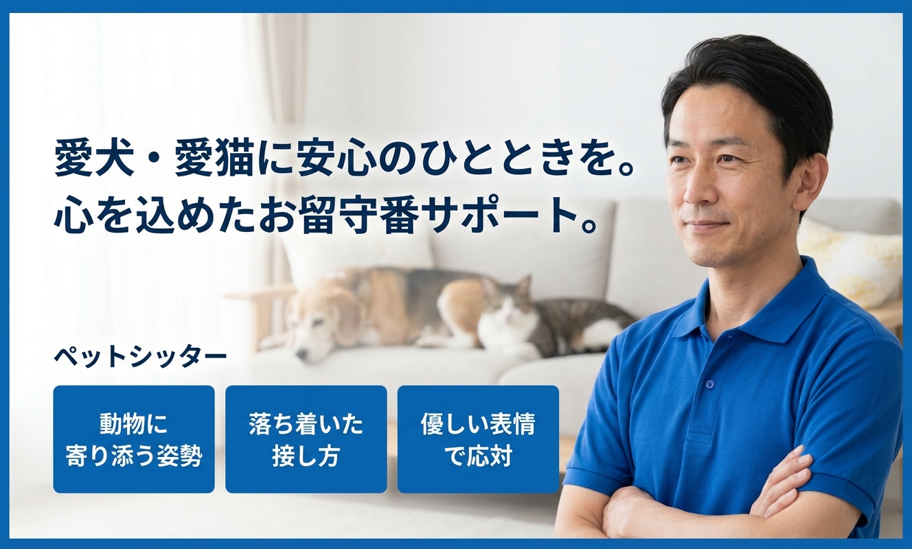 ご自宅でのお世話は犬、猫、鳥、ウサギ、フェレットなど幅広く対応が可能で食事、トイレ、ケージの掃除、体調確認などを行っています。寝たきりになったペットさんには介護付きのシッティングサービスがおすすめ。食事や排泄が自立でできなくなってもおむつ交換や褥瘡予防などの専門的なお世話と見守りを致します。完全に寝たきりになったり、様々な事情からご自宅でお世話することができない場合はシッター宅での24時間預かりも相談可能です。ペットさんの日常生活においてペットフードや予防薬の選び方、接し方や飼い方などわからないことがあったら無料相談も行っています。