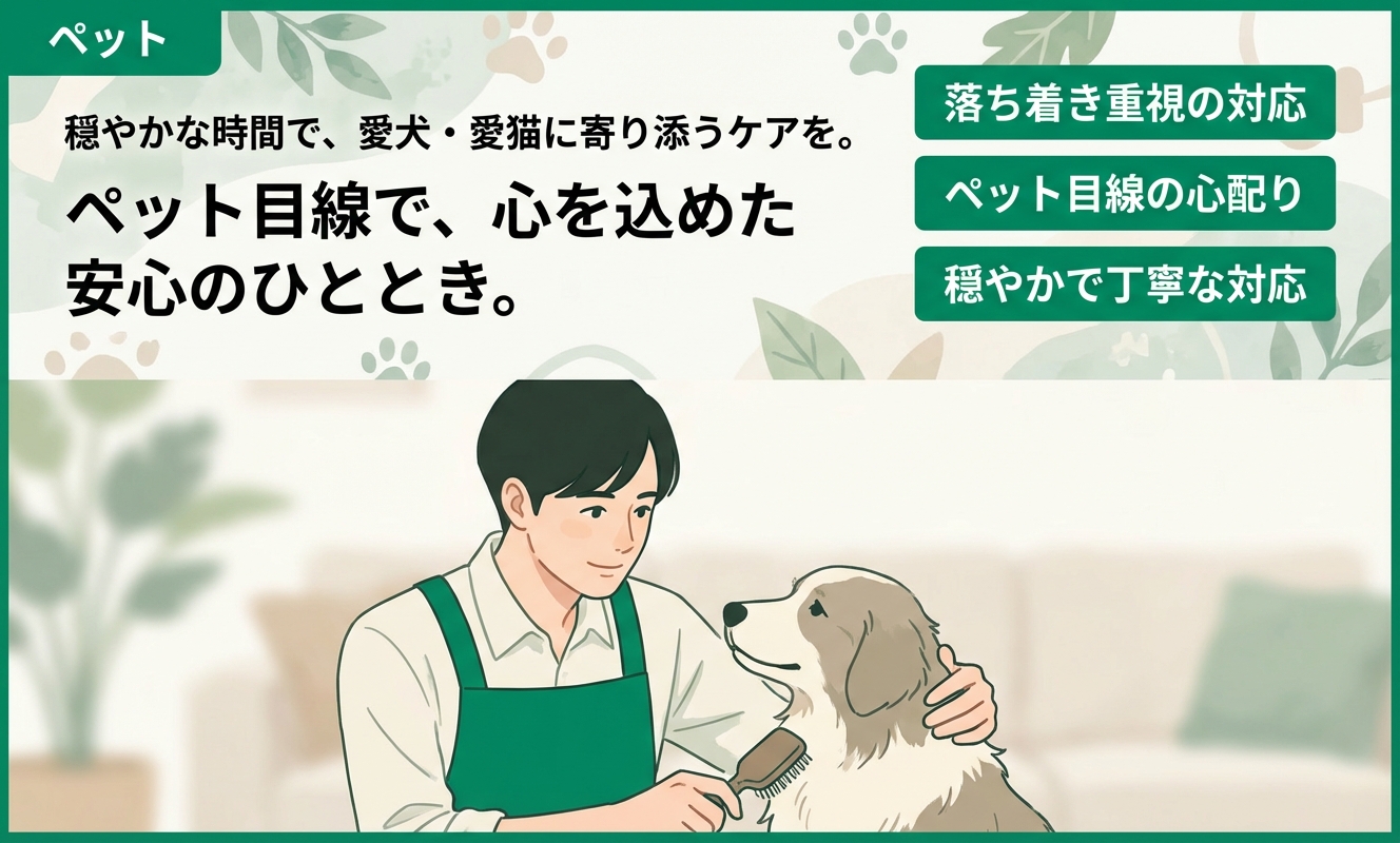 訪問ケアでは食事や水分補給、散歩や遊び、トイレのお世話、健康状態チェックなどに対応しています。ご利用前に詳しくお世話の仕方やペットの性格、普段の生活の様子などを伺い、それにに沿ってなるべくいつものように過ごせるよう丁寧に関わります。また、ご様子が急変した時のためにかかりつけ医や緊急連絡先についてもしっかり共有いたします。犬だけではなく、猫や小動物もケアが可能です。滞在時間は基本1時間となりますが、複数のペットがいる場合やお世話内容によっては滞在時間の延長にも対応します。環境が変わることが苦手なペットさんのシッティングは愛玩動物飼養管理士の資格を持ったスタッフがいるペットヘルパー・モアにお任せください。
