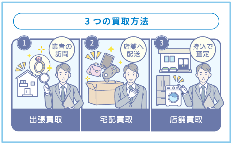 以下に各買取方法をまとめましたので、参考にしてみてください。買取方法 特徴 出張買取 自宅まで来て査定・買取をおこなう 宅配買取 品物を送るだけで査定・買取が可能 店舗買取 直接店舗で、査定・買取をしてもらう