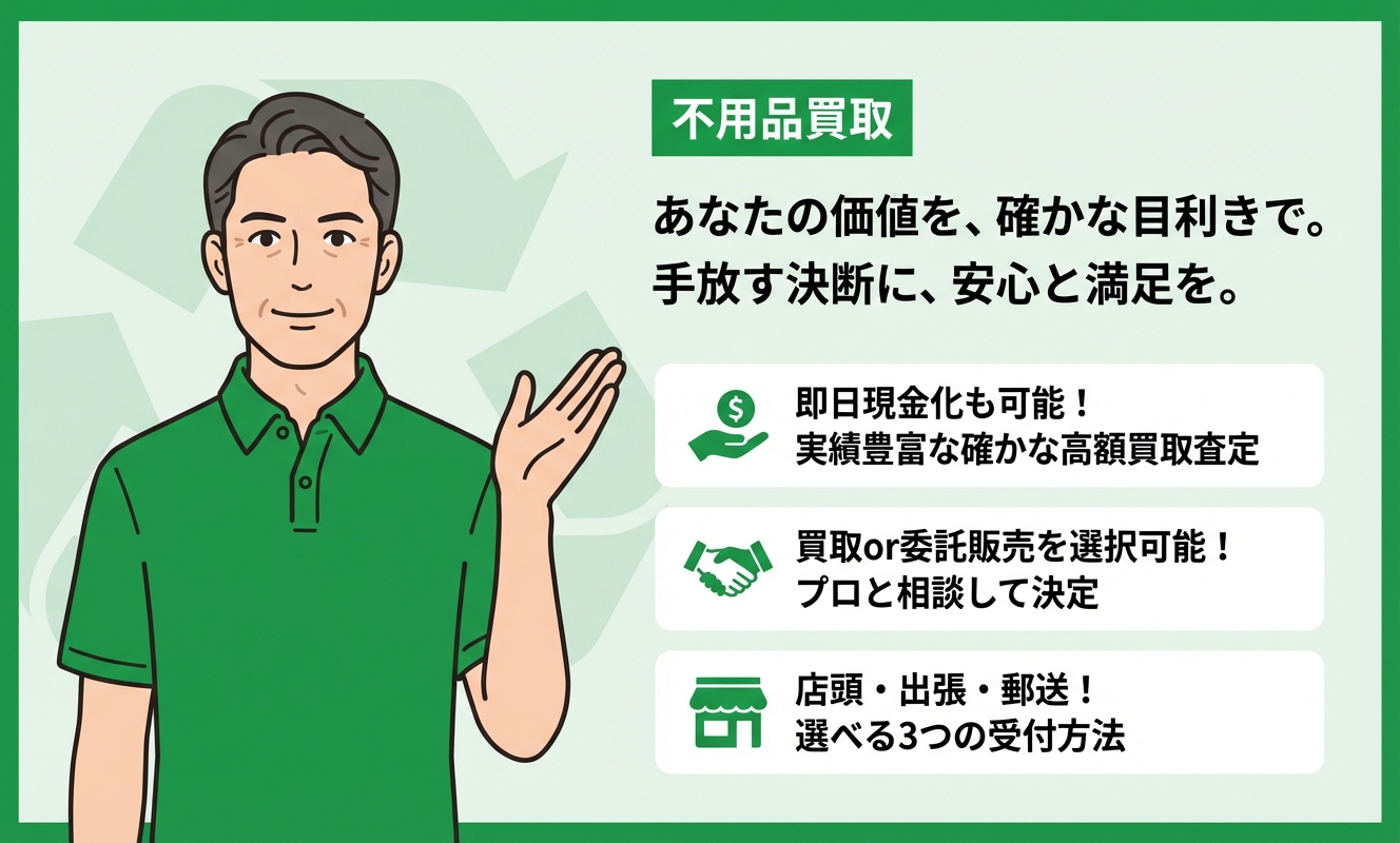 リサイクルショップ ブルームは、お客様のニーズに応じて「買取」と「委託販売」の選択肢を提供し、最適な売却方法を提案します。丁寧な接客と、確かな査定技術が大きな魅力です。また、店頭だけでなく出張・郵送も選べ、手軽に売却できる利便性の高さも支持されています。