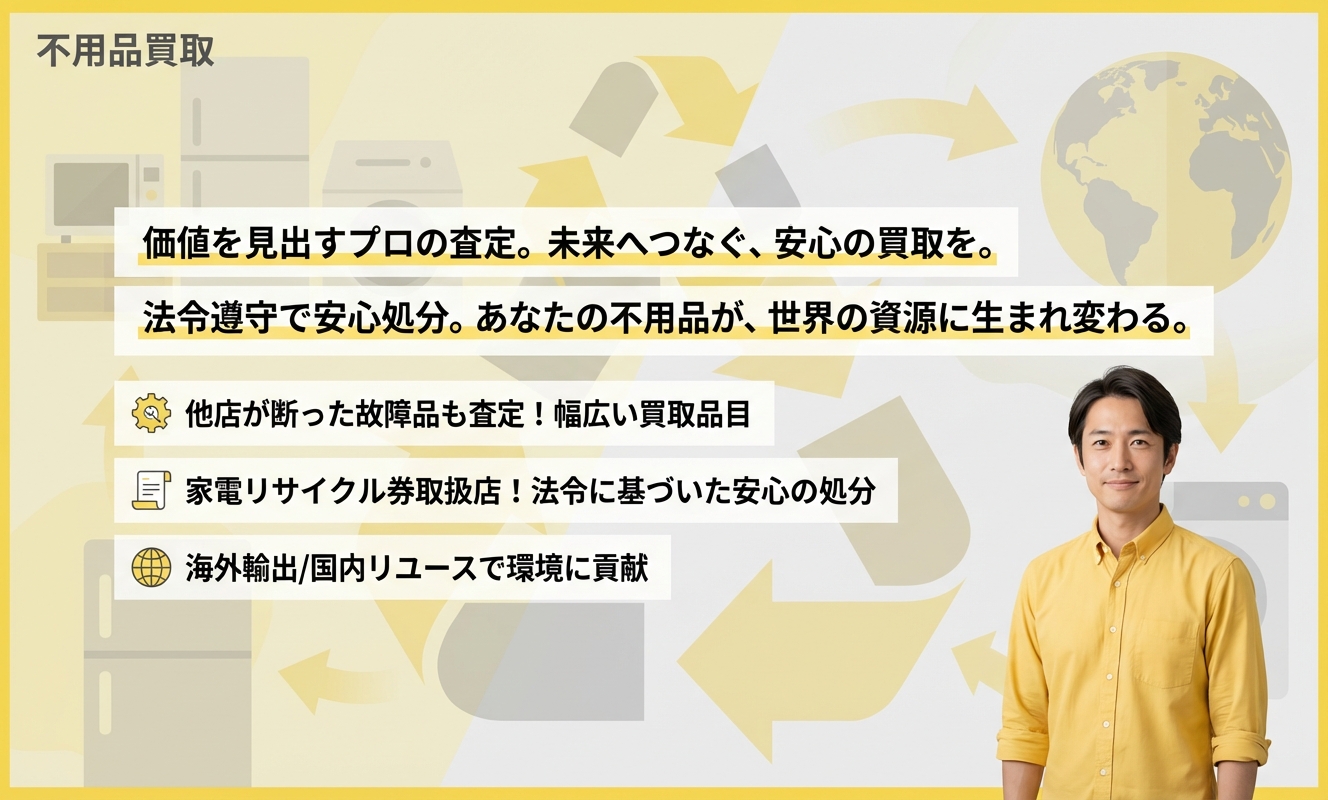 株式会社アイアールは、不用品の「リユース」に特化することで、価値ある循環型サービスを提供しています。他店では難しいとされる故障品や古い製品も積極的に買取・引取する懐の深さが魅力です。特に、家電リサイクル券取扱店であり、法令を遵守した安心・安全な処分をサポートしている点は、お客様が安心して取引できる大きな信頼ポイントです。
