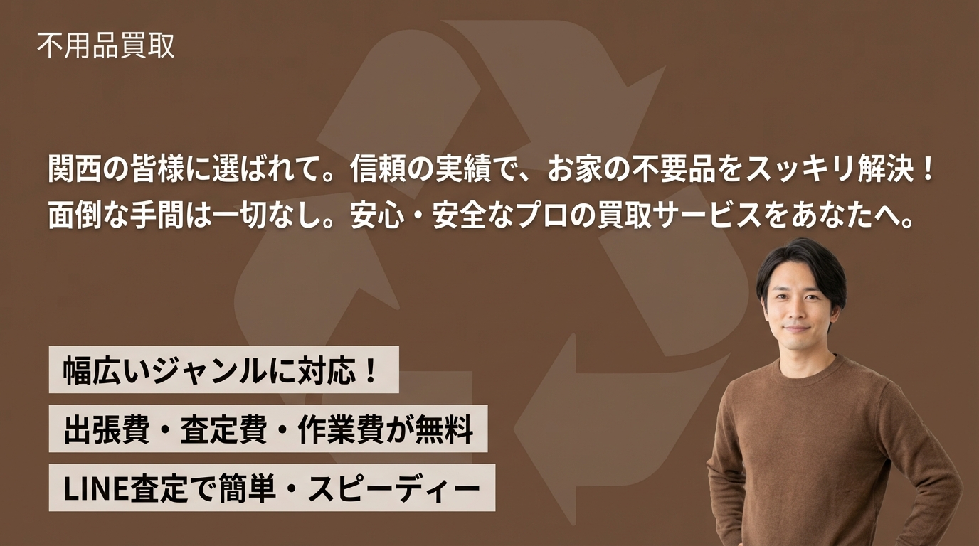 関西リユース本舗は、大型の家具や家電をはじめ、専門性の高い品までオールジャンルに対応する利便性が大きな強みです。LINEで写真を送るだけで手軽に見積もりが可能など、利用者の負担を軽減する仕組みが整っています。買取が成立すれば、作業費が無料で、安心して不用品の整理を進められる専門業者です。