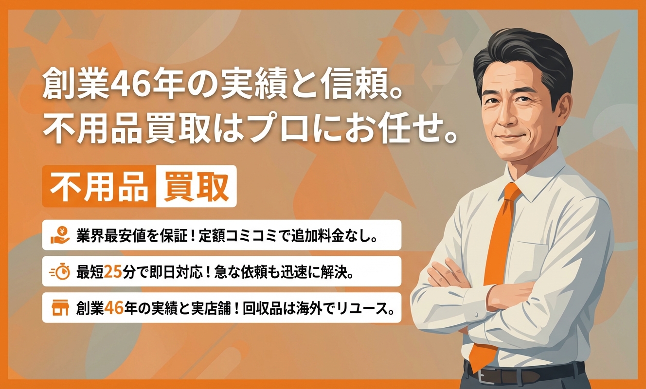 リユース本舗の最大の魅力は、業界最安値へのこだわりです。他社の見積もり提示で1円でも安くできる自信があり、定額コミコミプランで追加料金の不安もありません。また、最短25分で即日対応可能なスピード感に加え、回収品を海外でリユースすることで環境にも配慮しており、コストとエコを両立したいユーザーにとって信頼性の高い事業者です。