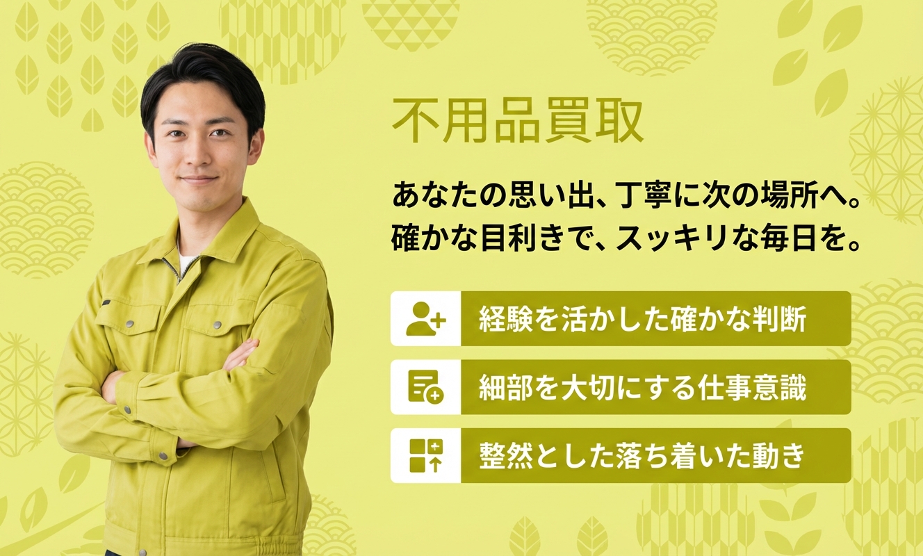 不用品の回収・買取から、部屋の片づけなどの便利屋などをしている業者です。不用品の処分と買取を同時にできるので、手間なく、お家の片づけができます。不用品の中から、電化製品をはじめ、家具・工具類・オーディオ機器・楽器・ゲーム・ブランド品・骨董品・自転車などを買取しています。買取のみの依頼も可能です。無名のトラックで訪問するので、近所の方に買取・不用品処分などが知られることがありません。相談料・出張見積もり料・見積もり後のキャンセル料は無料です。LINE査定もしており、査定希望商品の写真と品番などを送ることで、手軽に査定をしてもらえます。出張対応エリアは、広島市内を中心に安芸郡、東広島市、呉市、竹原市、廿日市市、安芸高田市となっています。