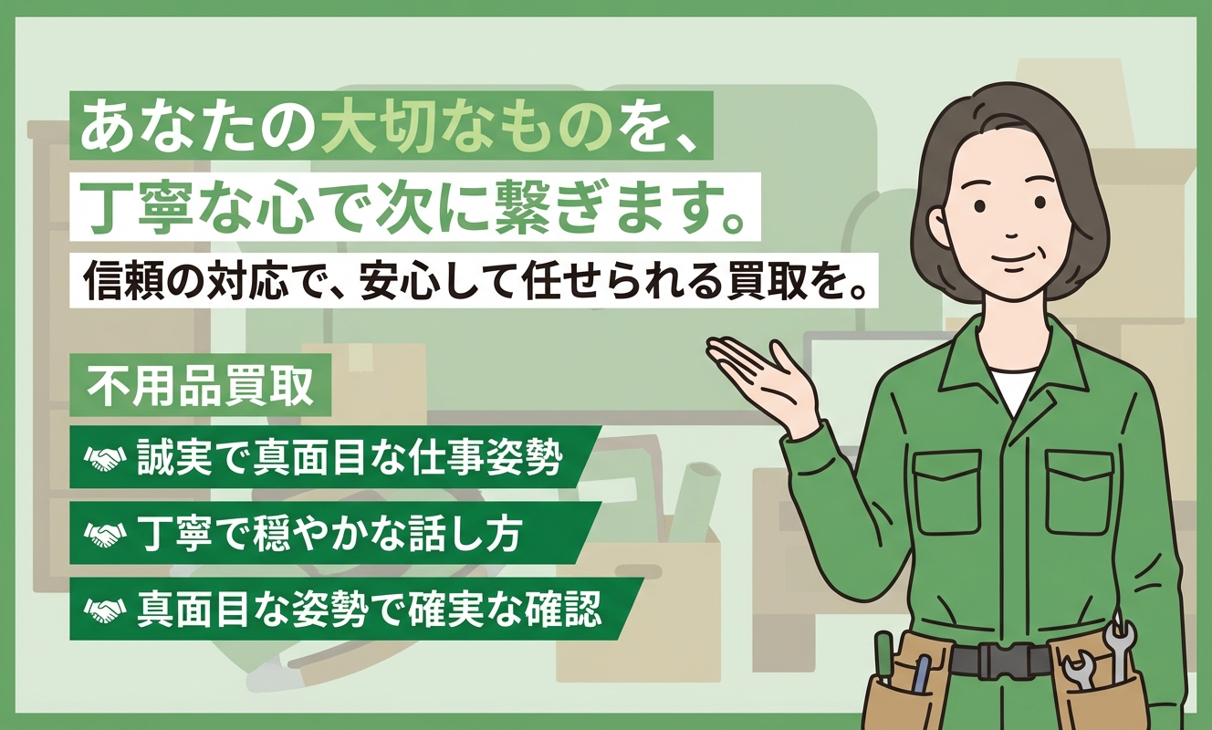 北海道で不用品の処分・買い取りをしている業者です。遺品整理、ゴミ屋敷の処理、事務所・工場の片づけ、引っ越しサポートなど、不用品の処分と同時に買い取りできるアイテムについては、買い取り対応をしています。不用品処分と同時に買い取りもしてもらえるので、処分と買い取りを別々に依頼する手間を省くことができます。電化製品をはじめ、家具、ブランド品、貴金属、骨董品、自働車、マリンジェットなどの買い取りに対応しています。品物の状態によっては、高価買い取りになる場合もあり、臨時収入につながることもあります。買取と不用品処分の作業費用を相殺することもできます。