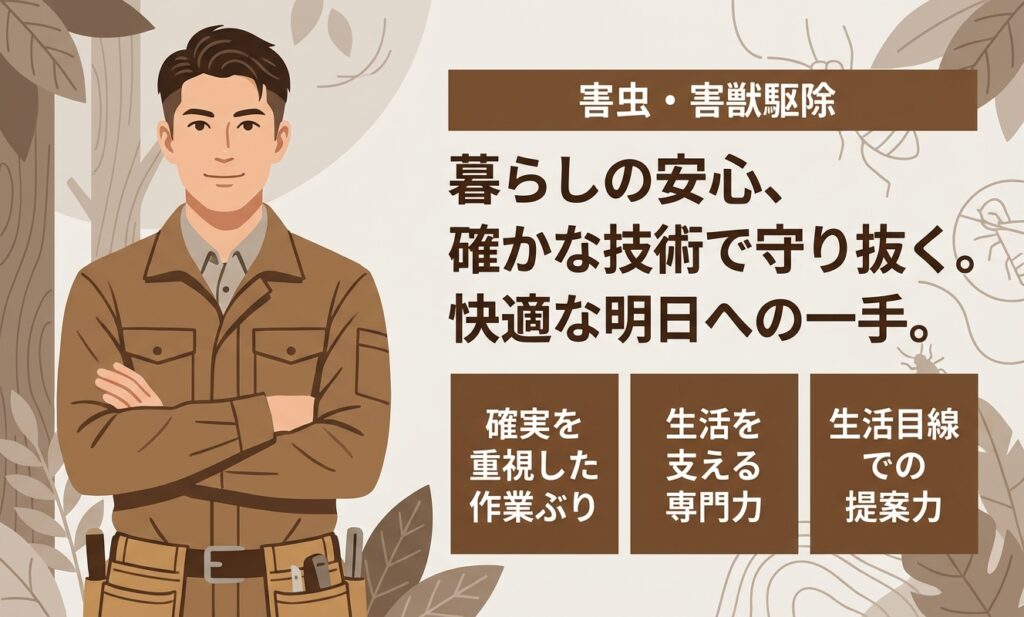 以前から何度もゴキブリが出ていて市販の駆除剤では改善されず、根本的な対策を求めて依頼しました。電話対応から調査、施工に至るまで全体的にスムーズで、侵入口の特定や封鎖作業まで徹底してくれました。何よりうれしかったのが、保証付きのサービスで再発のリスクを大きく減らせた点です。料金についても、後から高額請求されるのではと不安でしたが、見積もり通りの価格で安心でした。説明も非常に分かりやすく、信頼してお願いできました。