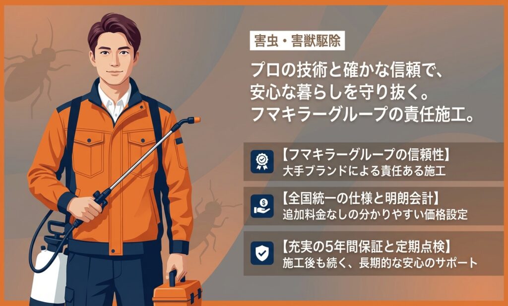 料金は、駆除対象の種類、侵入範囲の広さ、作業内容、利用するサービスの範囲などによって異なります。事前に見積もりを取得することが一般的です。