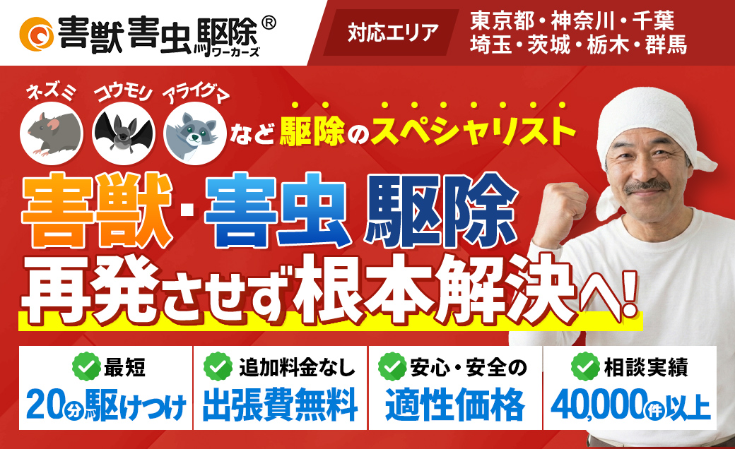 害獣害虫駆除ワーカーズは、ハクビシン、アライグマ、イタチ、コウモリなどの害獣や害虫駆除に特化したサービスを提供しています。お住まいのエリア近隣で、最短20分でお伺いし、調査・駆除・清掃・消毒・再発防止をトータルで行います。経験豊富なスタッフが迅速かつ丁寧に対応し、お客様の安心と快適な生活をサポートします。調査・見積もりは無料で、再発保証も提供しています。ぜひ、お問い合わせください。
