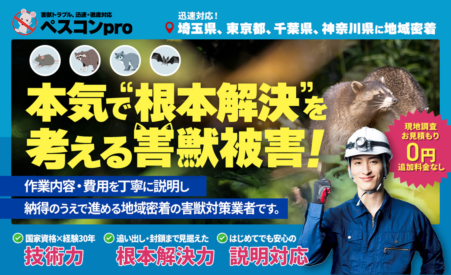 ペスコンproは埼玉・東京、千葉・神奈川を中心とした地域密着型の害獣駆除業者です。お客様の不安な気持ちに深く寄り添い、質の高いコールセンターで丁寧に状況をヒアリングした上で訪問するため、初めての方でも安心してお任せできます。
