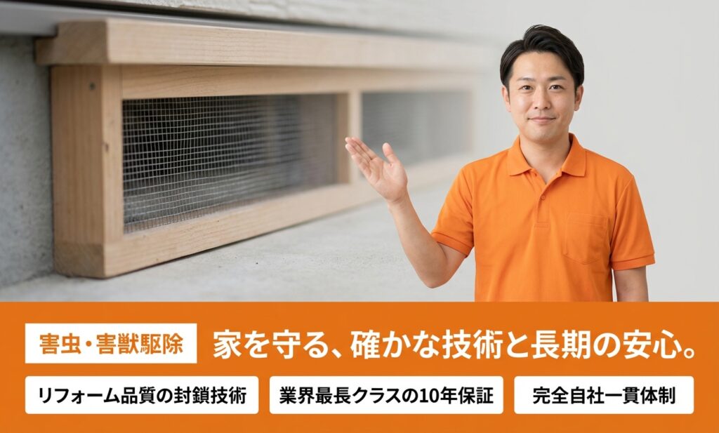 まず、専門の手法でハクビシンを完全に追い出し、その後、天井裏や壁裏に残された糞尿を隅々まで清掃しました。菌や臭いを断つために徹底した消毒・除菌作業を行い、清潔な環境を取り戻してから、最大の課題であった侵入経路(床下通風口)を頑丈な資材で封鎖する施工を実施いたしました。