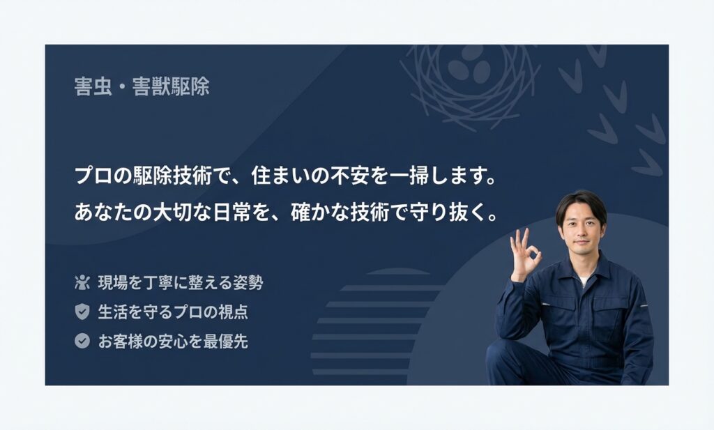 他社では「忌避剤の散布のみで50万円」という高額かつ一時的な提案をされ、不信感を抱かれていたようです。