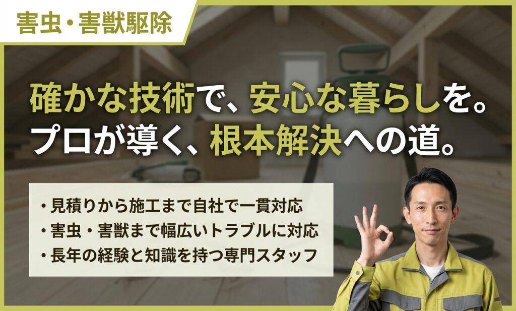 多くの駆除業者が苦手とする天井の解体や内装復元を自社施工で行うことで、侵入経路を完全に遮断。
