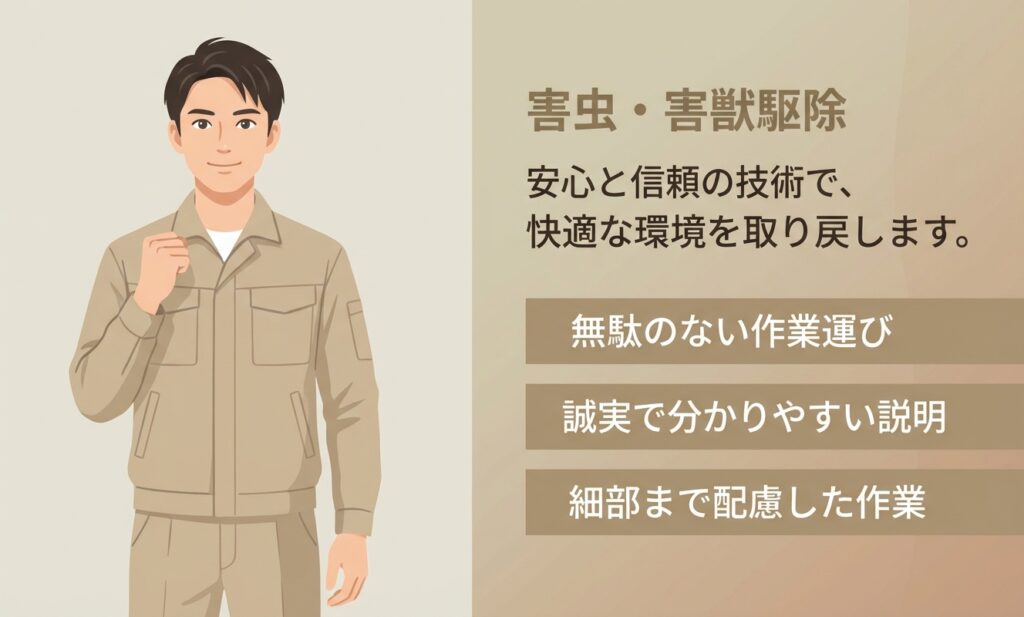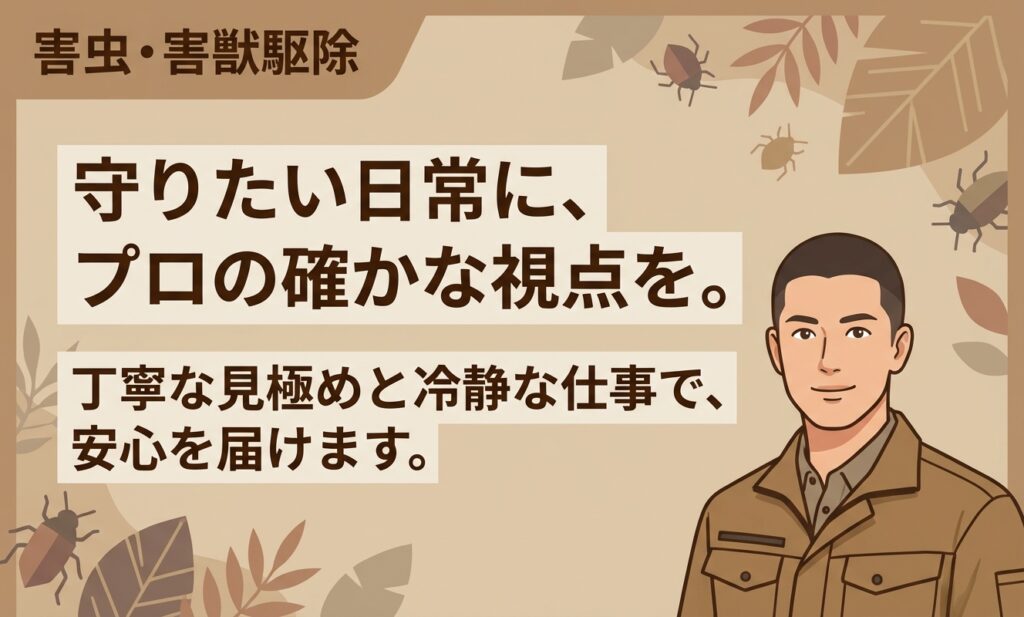 滋賀県で害虫駆除、害獣対策をしています。長年プロとして培ってきた豊富な経験と技術で害虫、害獣のお悩みに対応します。地域密着型で安心の価格設定でしています。親切・丁寧に対応します。