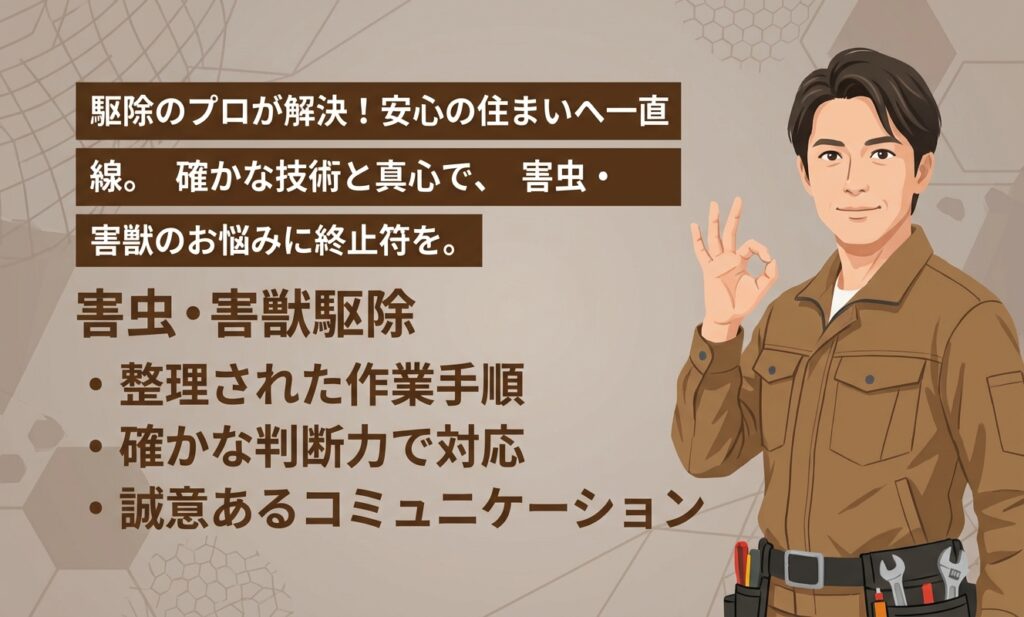 庭先で荒らされた跡が続き、気になって相談しました。スタッフさんが行動の癖や通り道を丁寧に確認し、追い出しから対策まで手際よく対応。安心できました。