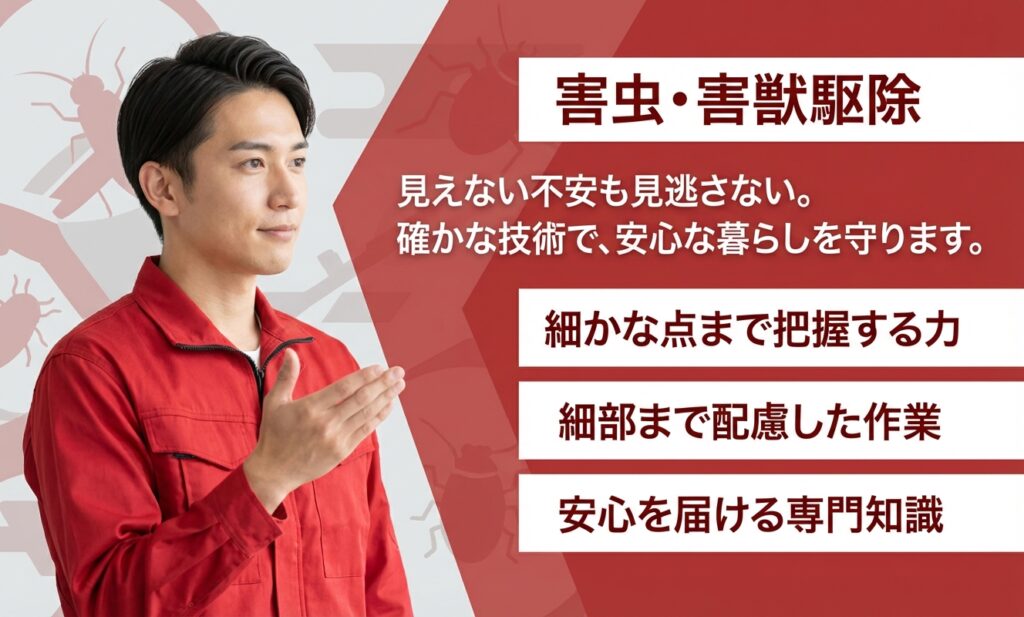 クリーニングサービスやエアコンサービスなど様々なサービスを展開しています。その中で害虫サービスも展開しており、害虫・害獣・害鳥の駆除・防除サービスも提供しています。専用の薬剤と道具で駆除をします。