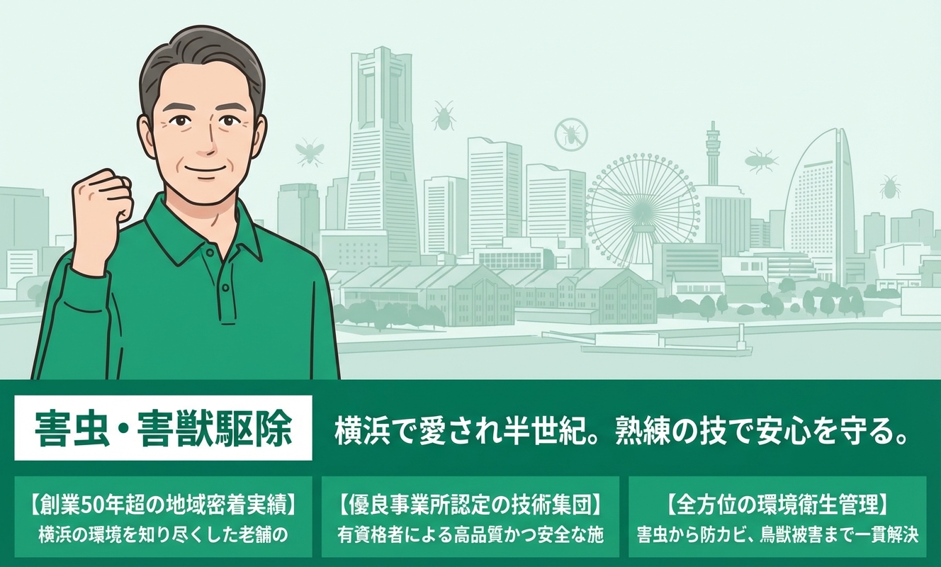 横浜エリアで50年以上の歴史を誇る、地域住民や企業からの信頼が非常に厚い一社です。1級ペストコントロール技術者などの高度な国家資格・専門資格を持つスタッフが在籍しており、技術レベルの高さは折り紙付き。単なる駆除だけでなく、発生原因を突き止める徹底した調査と再発防止策に定評があります。見積もりも無料で行っているため、住まいの小さなお困りごとでも安心して相談できる「街の頼れる専門家」です。