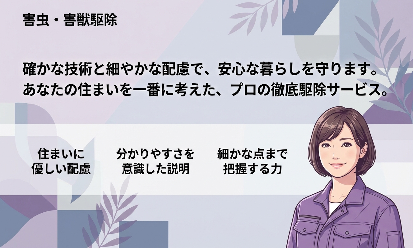株式会社シー・アイ・シーは、東京都台東区に本社を構え、全国に拠点を持つ害虫・害獣対策の業者です。幅広いエリアに対応し、建物の規模や環境に合わせた作業を行っています。外壁塗装を検討するタイミングで、同時に衛生環境の維持や被害の予防を考える場合に活用できる選択肢となります。地域性を考慮した柔軟な対応もポイントといえます。