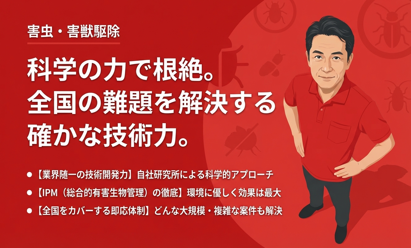 国内屈指の実績と、自社に専門の研究施設を保有するほどの高度な技術力が最大の魅力です。スタッフの教育体制も非常に厳格で、専門資格保持者が多数在籍しており、その知識レベルは業界トップクラスといえます。HACCPやISOなどの国際基準に対応した管理が求められる法人顧客からも絶大な信頼を得ており、家庭向けのサービスにおいてもその「プロ中のプロ」による高品質な施工を享受できるため、究極の安心感を求める方に最適な選択肢です。