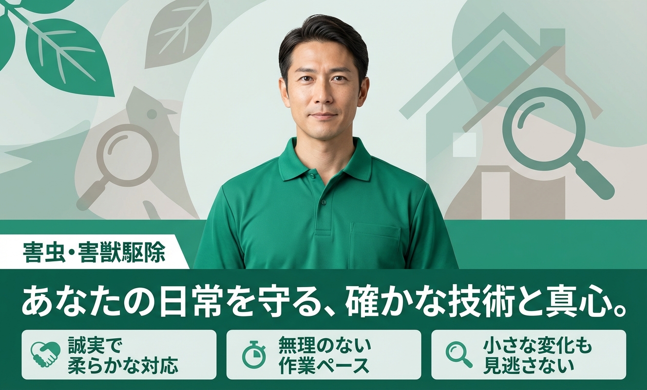シロアリ駆除を中心に様々な害虫・害獣の駆除をしています。34年の経験と実績があるので任せて安心です。使用する薬剤も「普通物」指定の安心な物を使っています。当社及び薬剤会社からの二重保証でより安心です。