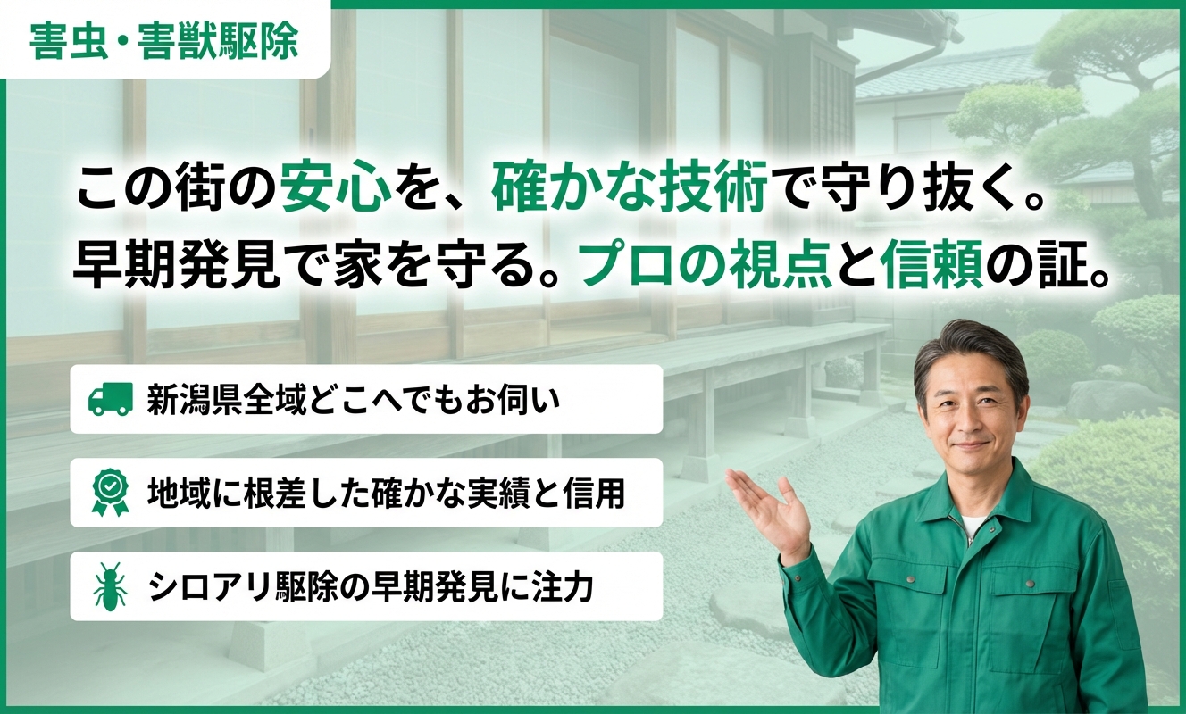 新潟第一消毒は、長きにわたり地域に根ざし、確かな実績を誇る害虫駆除の専門家です。県内全域の広範囲に対応しており、白アリや害虫に関するどんな相談にも親身になって対応してくれます。特に新潟市在住の方は「すこやかパスポート」も利用できるなど、地域サービスへの貢献度が高い業者です。