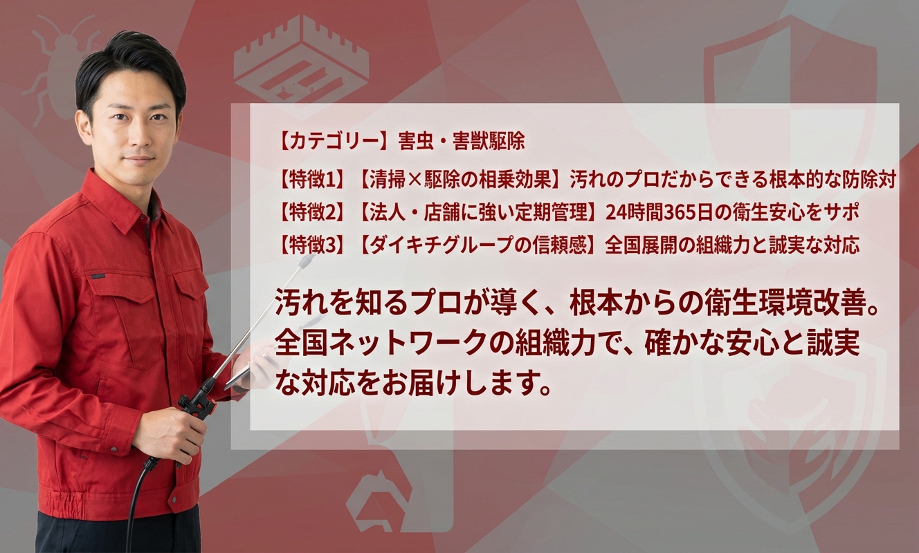 「清掃のプロ」としての視点を持っていることが、他の駆除業者にはない大きな特徴です。単に薬剤を散布するだけでなく、害虫が発生する根本原因である「汚れ」や「環境」の改善を同時に提案してくれるため、長期的な防除効果が期待できます。大手グループならではの組織力と、徹底したスタッフ教育による質の高いサービス、そして明朗な管理体制は、特に衛生基準に厳しい飲食店や医療機関から高い評価を得ています。