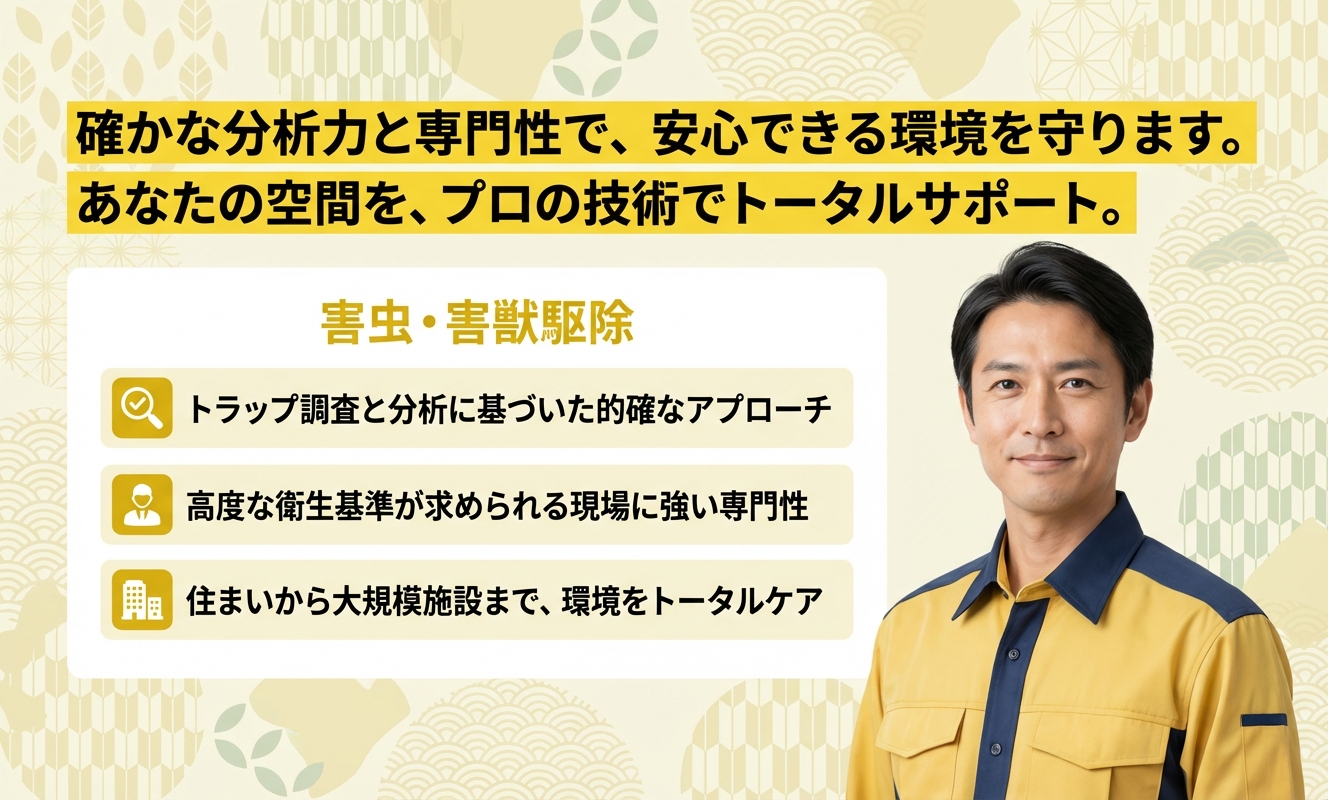 単なる駆除作業にとどまらず、サステナブルな視点と科学的な分析を融合させた、非常に信頼性の高い業者です。日本しろあり対策協会や日本ペストコントロール協会の会員として、最新の知見を常に施工に反映しています。食品検査部門を併せ持つため、衛生面へのこだわりは業界でも随一。再発防止を徹底するためのモニタリング調査や、環境負荷を抑えた防除提案など、質にこだわる方にこそ選んでいただきたい一社です。