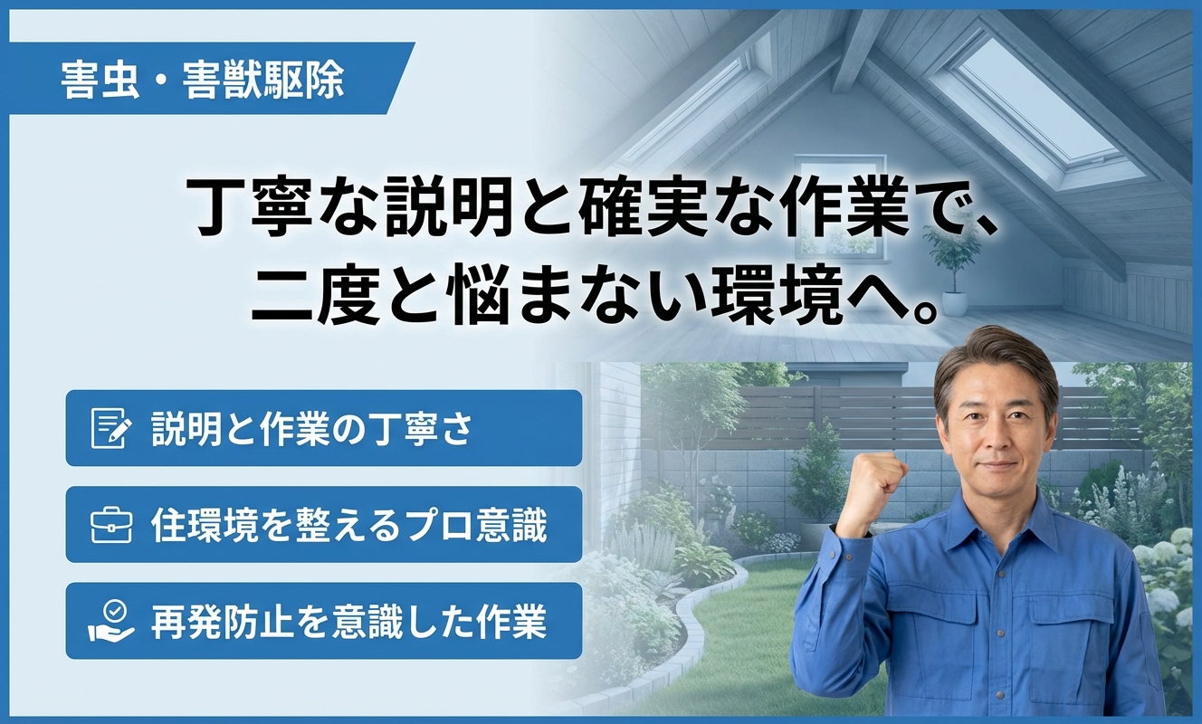 株式会社協和エムザーは、故人及び法人向けに虫や水のドウターとして困り事を解決しています。虫の困り事についてはシロアリ対策及び有害虫獣防止、鳥害防止を行っています。シロアリ対策については、習性を利用したベイト工法やバリア工法を用いた駆除防除を施工します。有害虫獣防止については、ゴキブリやカメムシなどの害虫、ネズミなどの害獣に対して多彩な駆除技術・捕獲技術・侵入阻止技術を駆使して害虫獣のいない状態を維持します。鳥害防止については、防鳩テープ処理や防鳩ネット処理、ハトプロテクター処理で対策を立て、建物や商品、機械などの汚れを防止します。
