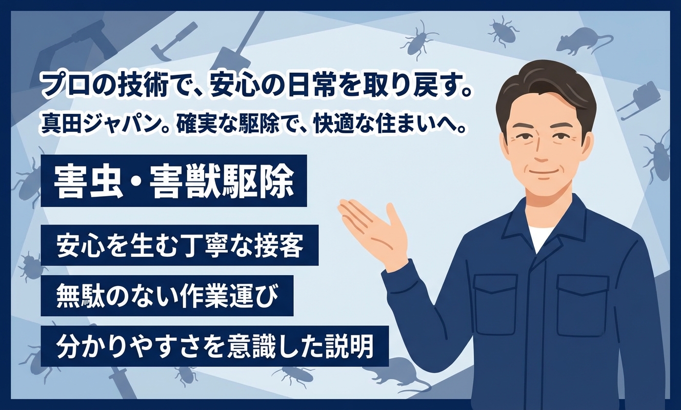株式会社真田ジャパンは、東北から関東にかけての広い地域で、ねずみをはじめとする害虫・害獣の駆除サービスを提供しています。「蜂の巣や害虫の駆除なら、真田ジャパンの『ご家庭なんでも応援隊』にお任せください!」をキャッチコピーに掲げ、特に蜂の巣駆除に自信を持っています。料金は20,000円からご利用いただけます。日曜・祝日も営業しておりますので、「庭先の蜂の巣が気になる」「屋根裏に蜂の巣がありそうなので見つけてほしい」といったお悩みに迅速に対応いたします。コバエやゴキブリ、アリの駆除も行っておりますので、お気軽にご相談ください。