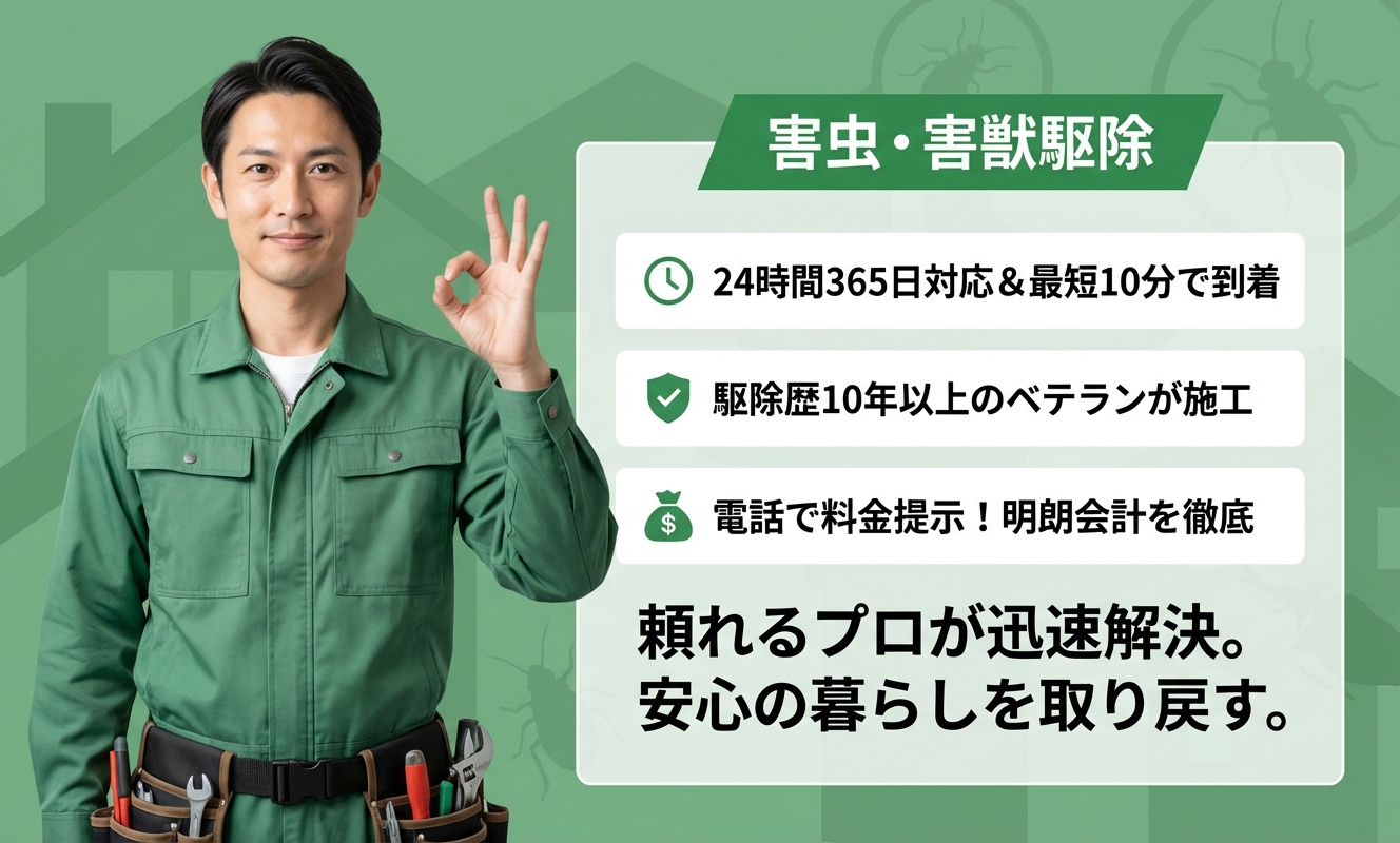 ゴキブリ駆除の虫駆除おまわりさんは、24時間365日体制で受付を行い、最短10分で現場に駆けつける迅速な対応力が特徴です。駆除歴10年以上の専門スタッフが、厚生労働省認可の薬剤を使い、子供やペットにも配慮した施工を実施しています。また、現地見積もり前の明確な料金提示と追加料金なしの明朗会計を徹底しており、年間10,000件以上の実績を持つ業者です。