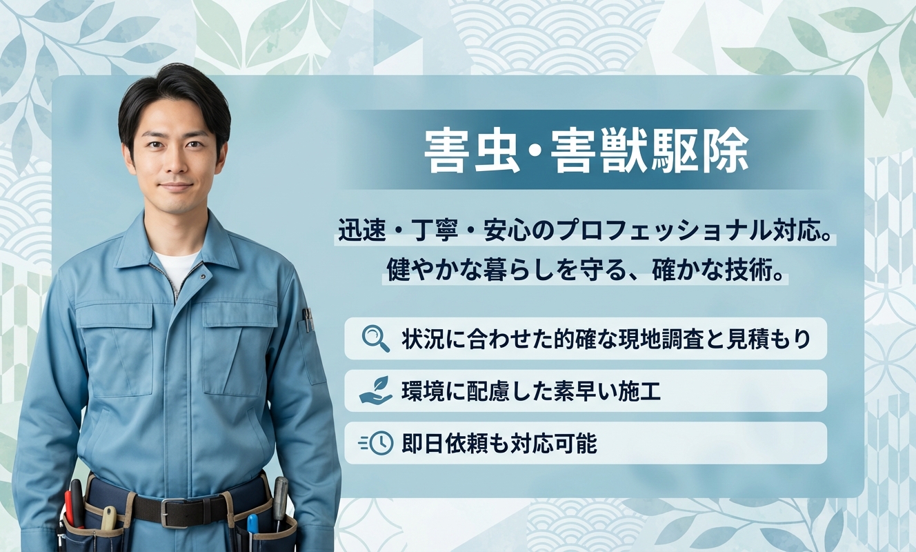 グリーンウォールは、害虫・害獣・害鳥の駆除・防除を行っており、人体や環境に配慮した薬剤を使用するだけでなく、建物に傷をつけないよう配慮した作業を徹底されています。また、駆除後の清掃や消毒、再発防止策にも力を入れており、施工後も安心して生活を続けられるよう、親身になって相談に乗ってくれる信頼の置ける存在です。