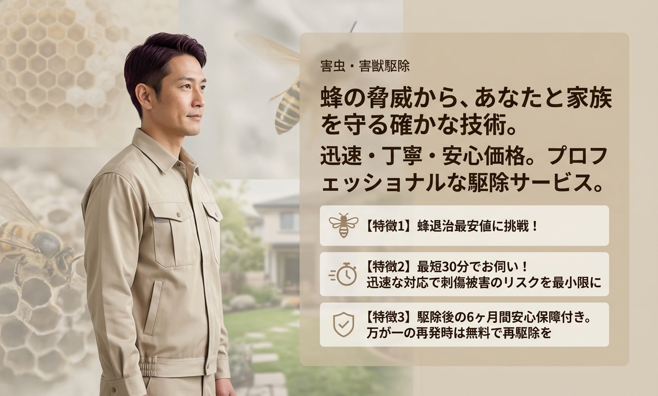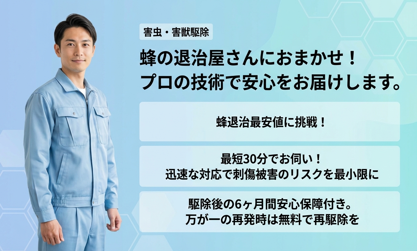 「蜂の退治屋さん」は、対応エリアを限定することで業界最安値級の低価格を実現しつつ、ご依頼から最短30分の迅速な現場到着を両立させている点が最大の強みです。また、難易度の高い高所や屋根裏の駆除にも対応する年間1万件の豊富な実績と6ヶ月の再発保障が、お客様に高い安心と信頼性を提供します。