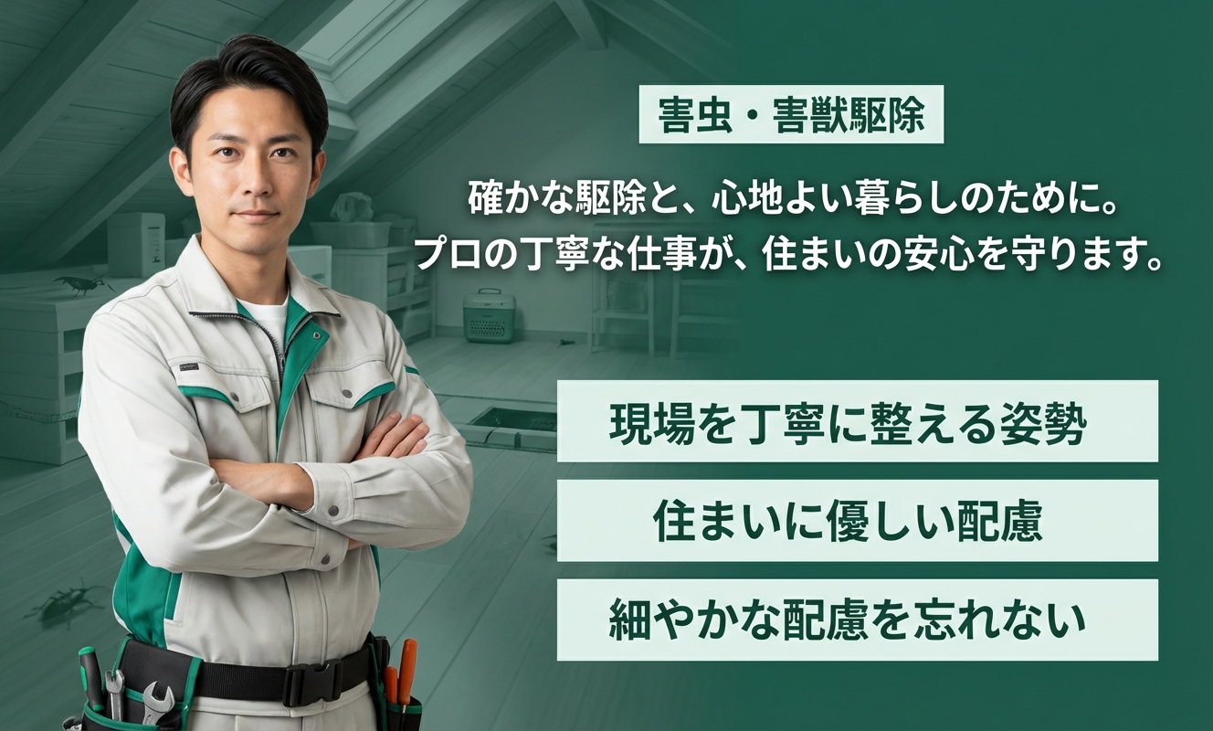 福岡市、北九州市、下関市、沖縄、広島に11店舗を有し、いわゆる「べんり屋」として様々な事業を展開しています。その一環として害虫駆除や害獣防除を行っています。害虫駆除、害獣防除のプロが的確な施工を致します。