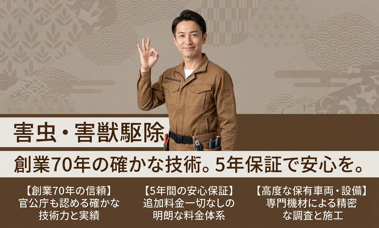 京都で70年近い歴史を誇り、官公庁からの信頼も厚い非常に安定感のある企業です。公共工事で培われた厳しい品質管理基準を、一般家庭のシロアリ駆除や消毒作業にもそのまま適用しているため、施工の正確性は群を抜いています。5年間の長期保証など、アフターフォローの充実ぶりからも、自社の技術に対する自信と責任感の強さが伺える一社です。