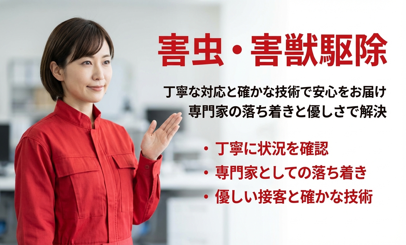 広島県薬業株式会社は、ゴキブリ、ネズミ、シロアリなどの害虫・害獣駆除を専門としています。清潔で健康的な環境を守るために、最新の技術と環境に優しい薬剤を使用し、迅速かつ丁寧に対応します。広島県全域をカバーし、地域に密着したサービスを提供しています。施工後のアフターサポートも充実しており、お客様の安心・安全を長期間にわたりサポートします。また、定期的な点検や予防措置も行っており、再発防止に努めています。さらに、害虫・害獣の種類に応じたカスタマイズされた対策を提供し、効果的な駆除を実現しています。