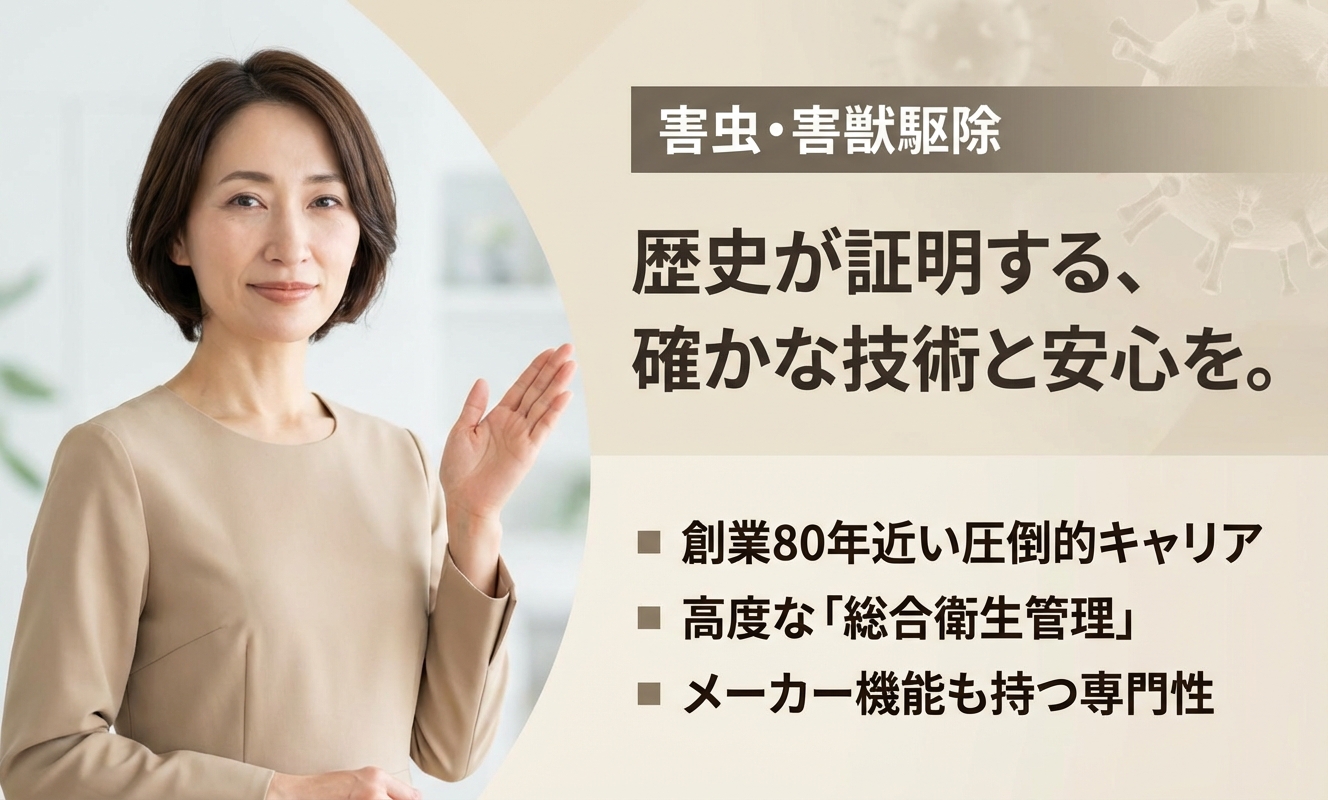 戦後直後から日本の公衆衛生に貢献してきた、業界屈指の歴史と技術力を誇る企業です。米軍指定業者としてスタートした経緯からも分かる通り、その信頼性は折り紙付きです。特に食品関連施設などの厳しい衛生基準をクリアするための知見が極めて深く、科学的根拠に基づいた緻密なデータ分析と対策は、プロも認める高品質な内容。法人のみならず、絶対的な安心と確実な成果を求める方にとって、最も信頼できるパートナーの一つと言えるでしょう。