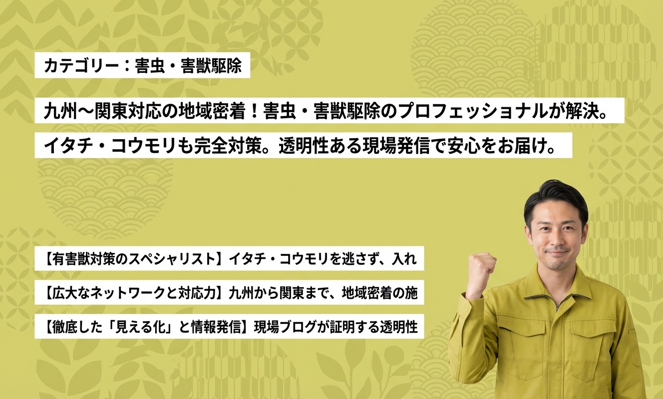 「駆除研究所」の名が示す通り、有害生物の生態を徹底的に研究し、根拠に基づいた対策を提案してくれるプロ集団です。特に屋根裏の音や糞尿被害に悩まされるイタチ・コウモリ対策では、全国トップクラスの経験値を持ち、再発させないための強固な封鎖工事に定評があります。ブログで日々公開されるリアルな現場報告からも、スタッフ一人ひとりの誠実さと技術への自信が伺え、深刻な被害に悩む方にとって非常に頼りになる存在です。