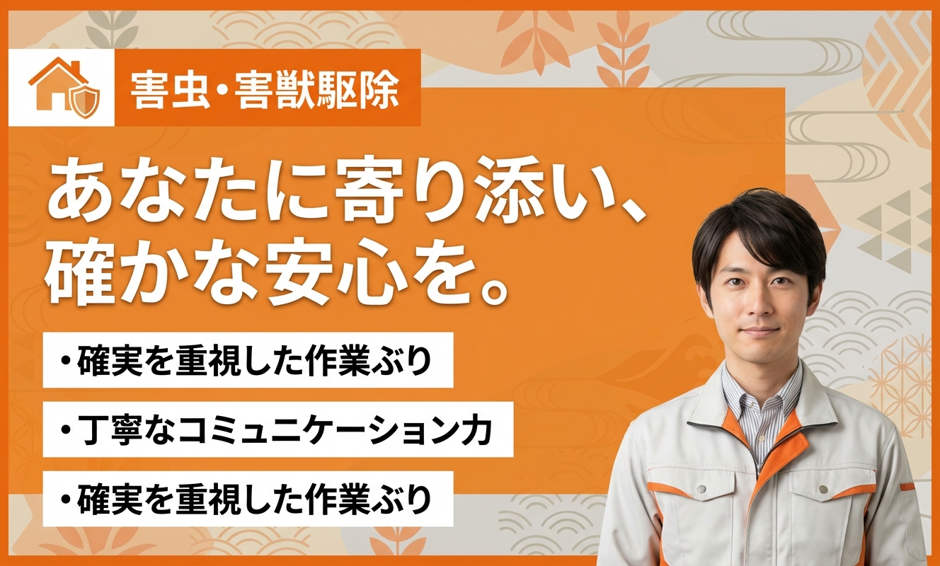 屋根裏や床下など被害の状況に合わせ、最適な方法を採用し、極力お客様の生活の妨げにならないよう安全に駆除を行います。また作業時には音やにおいなど最大限ご迷惑をかけないようにいたします。使用する薬剤には小さいお子様やペットにも安全なものを使用しています。損害補償保険に加入しております。駆除に伺う際はお客様の家具やお荷物の養生・移動も必要に応じて弊社で行います。万が一、建物や家財を破損してしまったなどの際の損害補償保険に加入しておりますのでご安心ください。