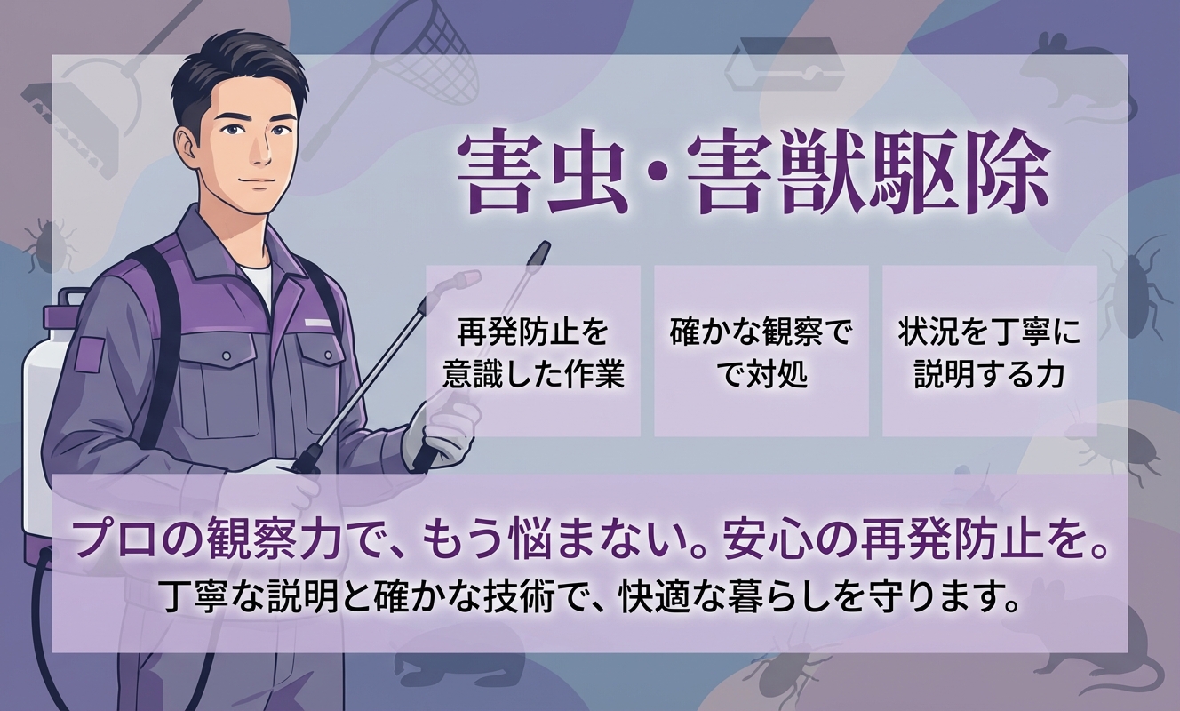 大分市に拠点を置く「虫鳥王」は、害虫・害獣・鳥・爬虫類駆除専門業者です。ゴキブリ、ネズミ、ハチ、ムカデ、ハト、コウモリ、イタチ、タヌキ、ヘビなど幅広い対象を個人宅や店舗、公共施設で対応。年中無休で地域密着の駆除サービスを提供しています。また、駆除だけでなく、リフォームやハウスクリーニングにも対応し、お客様の生活環境を総合的にサポートする姿勢が特徴的です。