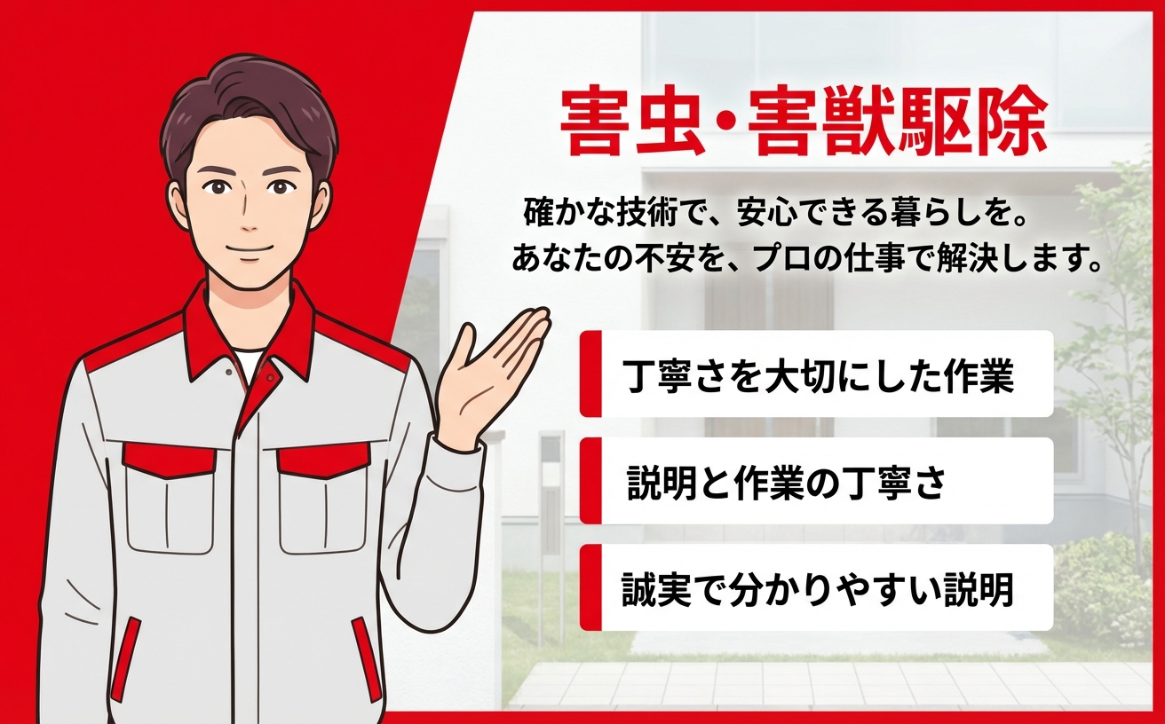 NPCは、東京都と神奈川県を中心に害虫・害獣駆除を行っております。私たちは、業界経験25年のプロとして適正価格でサービスを提供し、お客様に安心と満足をお届けします。料金は10,000円からで、国家資格を持つスタッフが、安全で効果的な薬剤を使用して駆除と消毒を行います。土日祝日も営業しており、急なご依頼にも柔軟に対応いたします。お客様の安全を最優先に考えたサービスを、ぜひご利用ください。